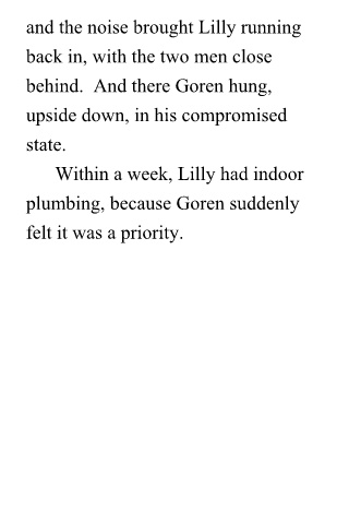 and the noise brought Lilly running back in, with the two men close behind. And there Goren hung, upside down, in his compromised state. Within a week, Lilly had indoor plumbing, because Goren suddenly felt it was a priority.