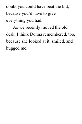 doubt you could have beat the bid, because you’d have to give everything you had.” As we recently moved the old desk, I think Donna remembered, too, because she looked at it, smiled, and hugged me.