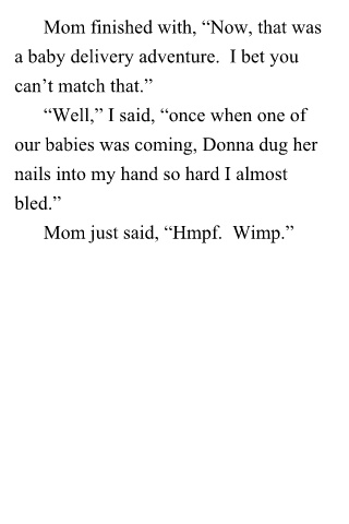 Mom finished with, “Now, that was a baby delivery adventure. I bet you can’t match that.” “Well,” I said, “once when one of our babies was coming, Donna dug her nails into my hand so hard I almost bled.” Mom just said, “Hmpf. Wimp.”