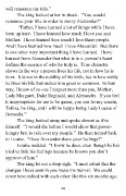 I know I owe much of that to his good spirit.” He paused for some time, then turned and looked at the queen. She had tears streaming down her face. “You knew this would happened when you sent her up here, didn’t you?” The queen nodded. “I hoped it would.” The king went to the window and gazed out for the longest time. He finally turned and looked at Louise. “I think Alexander would make a fine husband for a queen.” Louise squealed and ran to him and threw her arms around his neck and kissed him. “Oh, Father, thank you! Thank you!” The king laughed. “Now, don’t get all soft on me. You and your mother have a lot of wedding planning to do. But, perhaps, you might need to break the news to a certain young man.” Louise’s heart felt so light she nearly skipped from the room. Just as she was leaving, her father called after her. “Oh, and Louise? When you do marry him, I will expect him to make sure we have raspberries with milk and honey candy.” They grinned at each other as she shut the door behind her, and turned to run down the hall to Alexander’s quarters. She knocked on his door, but received no answer. That wing of the castle was still; too still. Something told her all was not well, but in her euphoric state, she shook it off. Thinking he might have gone to visit her, she hurried back to her own room. As she entered her living quarters, Elizabeth and 109