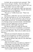 nothin’,” Old Mr. Brown said. “When his mother didn’t want him, I put him in the bum lamb pen, but he was out in two shakes of a lamb’s tail. Found his way out here before we could find a surrogate mother for him.” The sheepmen call the lambs that are rejected or orphaned “bum lambs.” I had watched the men try to get a ewe that had lost her lambs to feed an orphaned one by skinning out the ewe’s dead lamb and putting the skin on the bum lamb. If the men are lucky, the ewe will smell her lamb’s skin and think it is her own until she has accepted the new one. Then the dead lamb’s skin can be removed. There are usually more bum lambs than ewes to feed them, so many die. Sometimes the sheepmen try to bottle feed those they can. Once in a while, Old Mr. Brown lets me do that, which is a lot better than cleaning out stinkin’ sheep pens. “Yip,” Old Mr. Brown continued. “This little bummer decided we weren’t getting to him fast enough, so he took matters into his own hooves.” He chuckled at his own joke, then went on. “He just broke out of the bum lamb pen, though I can’t figure how, and he came out here to fend for himself.” I watched as the other little lambs that got out went crazy, racing around the pen, crying to get back in. Their mothers stood on the other side, frantically bleating to them. Meanwhile, the little bum lamb waited until everything had cleared, then went back in through the same hole and started looking for another ewe to steal a meal from. Mr. Brown caught the other two lambs and put them over the fence to their mothers. “It doesn’t matter how often I fix the holes in the fence; he finds another one. Not